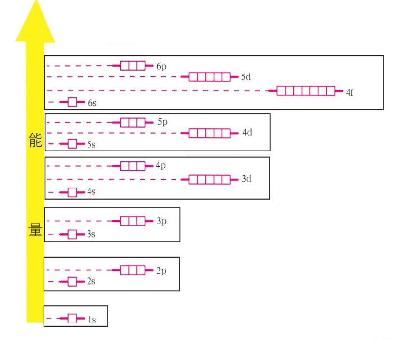 在这个图中,如果将 能量相近的原子轨道归为一组,所得到的能级组按照能量从低到高的顺序与元素周期表中的周期相对应。不同能级组之间的能量差较大,同一能级组内能级之间的能量差较小