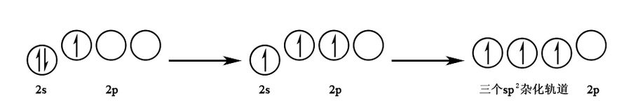 2. sp2 杂化:由 1s 轨道和 2p 轨道杂化而成,杂化轨道间夹角为 120°,呈平面三角形